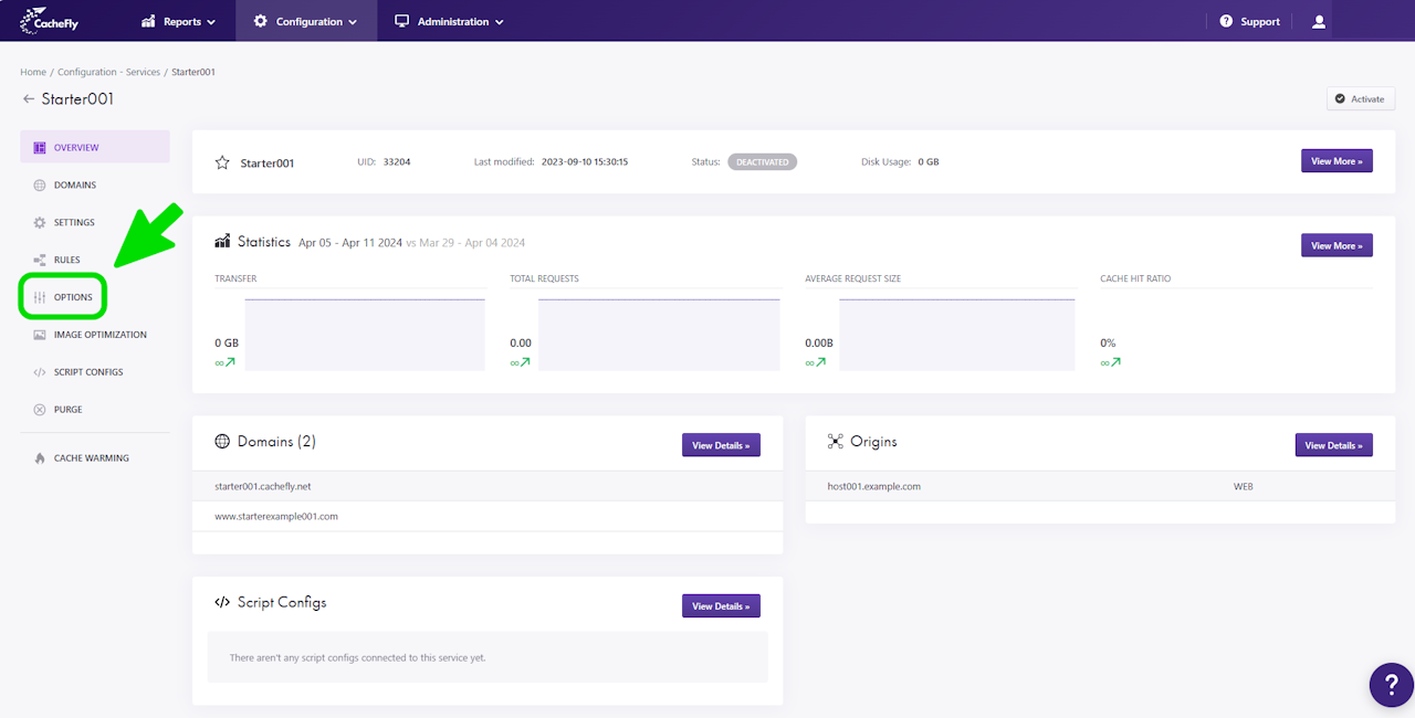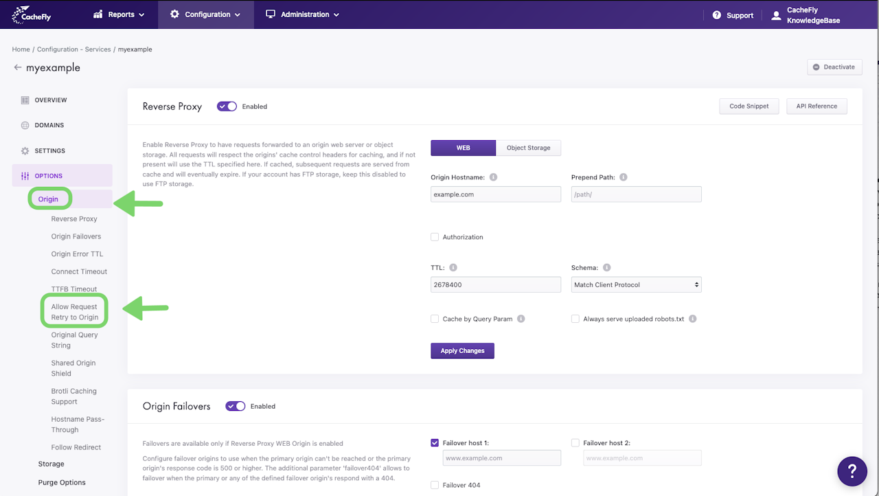To enable Allow Request Retry to Origin for a specific service, first navigate to the OPTIONS for that service (Configuration > Services > [SERVICE NAME] > OPTIONS in the left-hand menu).