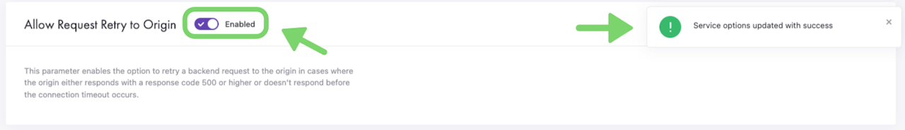 By enabling Allow Request Retry to Origin for the service, you can ensure that in these cases there is a retry of the backend request to the origin.