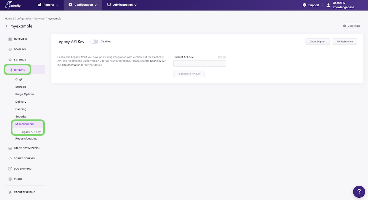 To disable a Legacy API Key for a given service, navigate to OPTIONS for that service and to the Legacy API Key section.