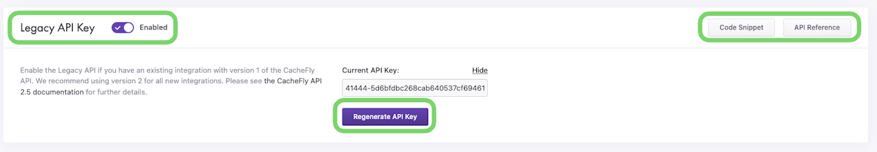 The Legacy API Key acts as a unique identifier and a secret token for authentication, and will have a set of access rights for version 1 of the CacheFly API.