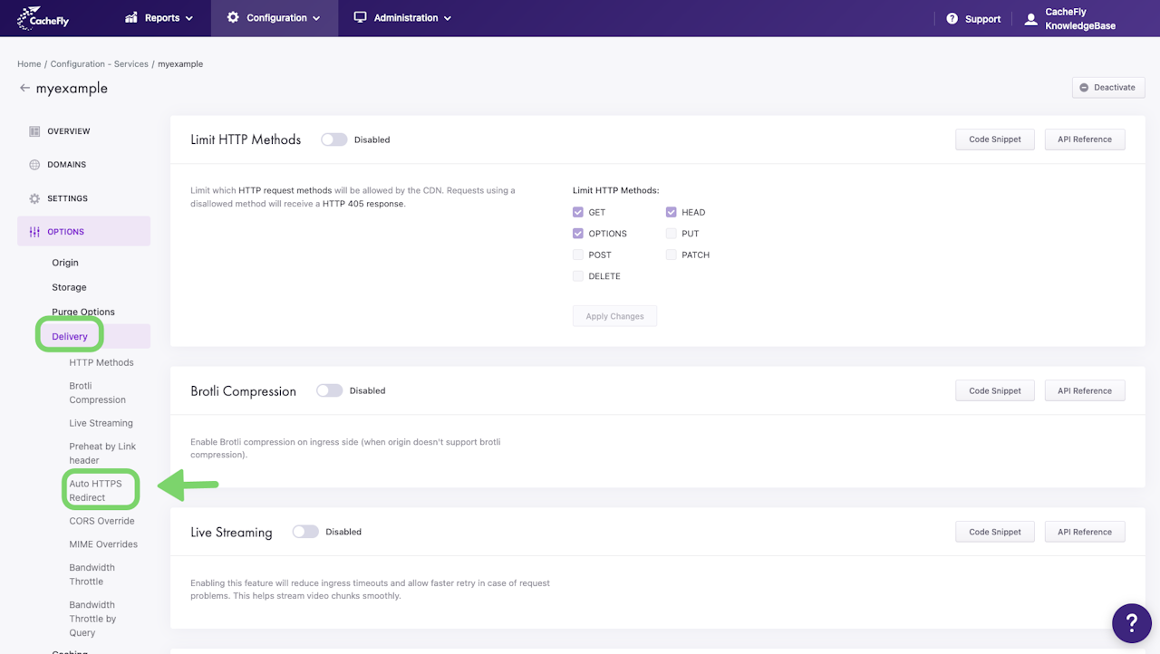 Click on OPTIONS to expand the menu. Then click on DELIVERY to expand the list of delivery options available. Click on Auto HTTPS Redirect, or scroll down until you reach the Auto HTTPS Redirect section.