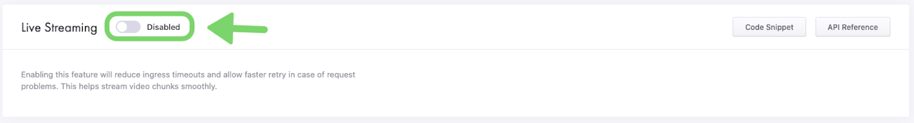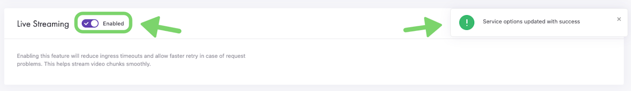 Enabling Live Streaming for a CacheFly service will reduce timeouts when serving user requests (ingress timeouts) and allow faster retry in case of request problems. For example, this helps stream video content smoothly.