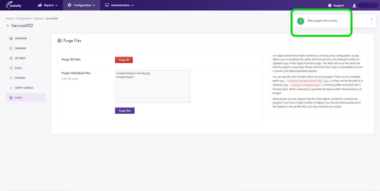 When you click on the red button Confirm, CacheFly purges the objects that you have indicated and displays an on-screen confirmatory message.