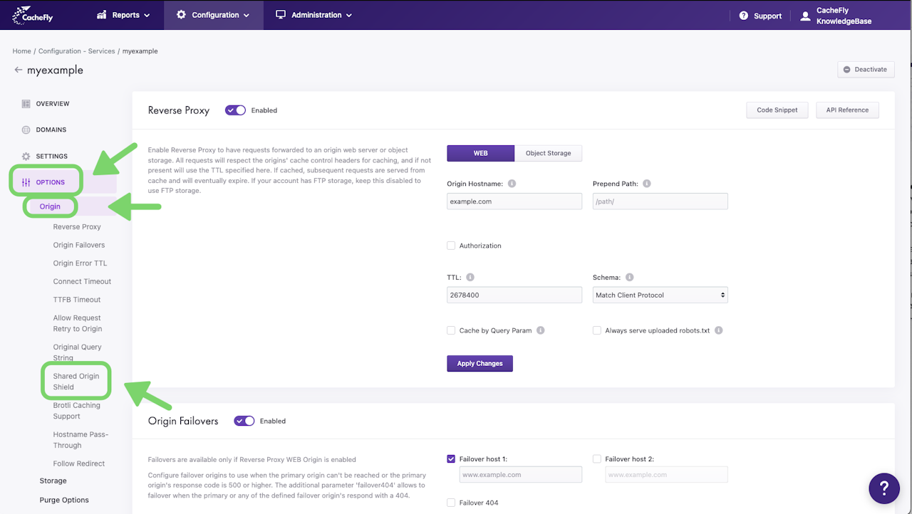 To set Shared Origin Shield for a specific service, first navigate to the OPTIONS for that service (Configuration > Services > [SERVICE NAME] > OPTIONS in the left-hand menu).