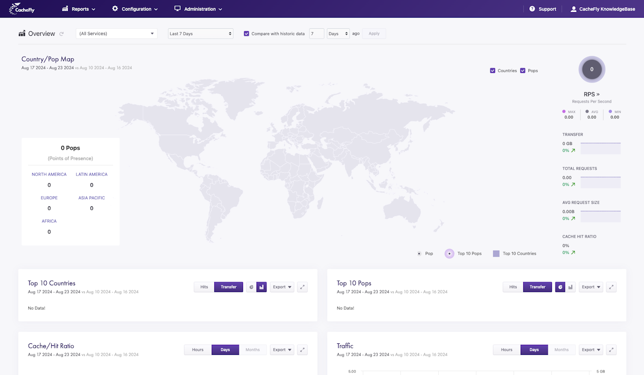 The first screen that you will see is the Reports Overview screen, showing a map of the world and your current CacheFly statistics.