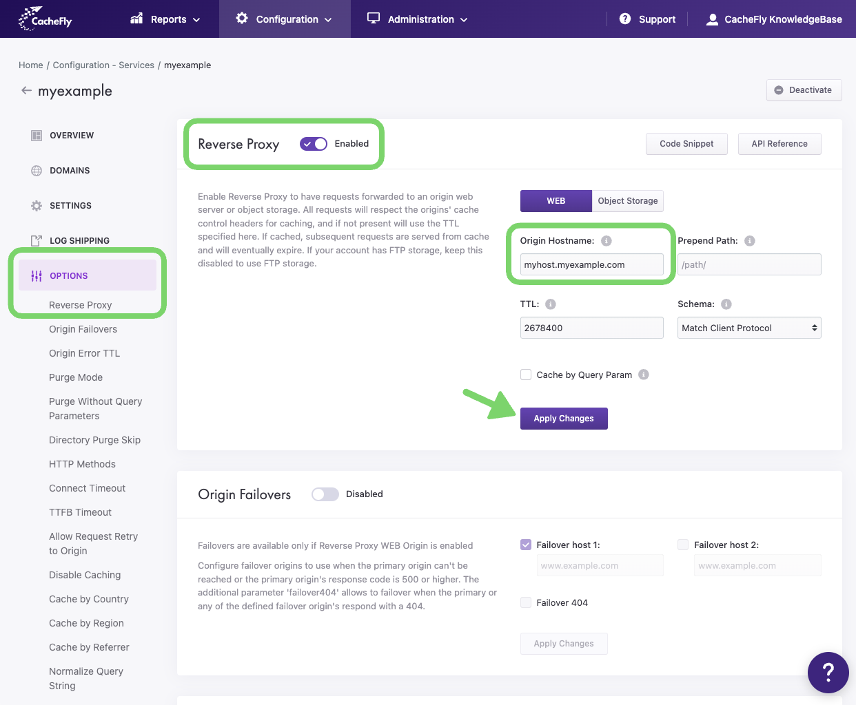 If a request for your content cannot be fulfilled directly by the CacheFly CDN, CacheFly can forward the request to your origin, if you enable Reverse Proxy for your service. All requests served by Reverse Proxy in this way will have their results cached, so that subsequent requests are served from cache storage in the CacheFly network. Objects (page text, images, and so on) cached like this will eventually again expire and be automatically refreshed.