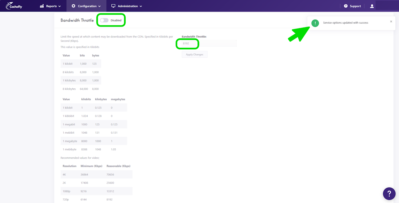 You can change the value of Bandwidth Throttle for individual CacheFly services. See more on creating and managing a service.