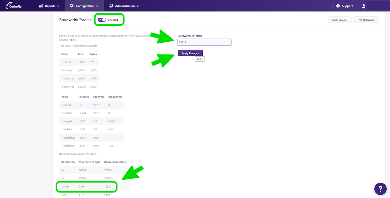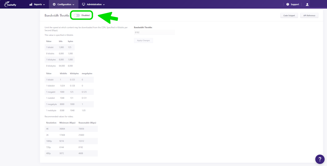 Bandwidth Throttle limits the speed at which content may be downloaded from the CacheFly content distribution network. This speed limitation is specified in kilobits per second (kbps).