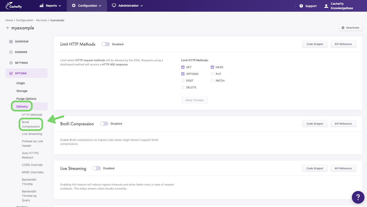 Click on OPTIONS to expand the menu. Then click on DELIVERY to expand the list of delivery options available. Click on Brotli Compression, or scroll down until you reach the Brotli Compression section.