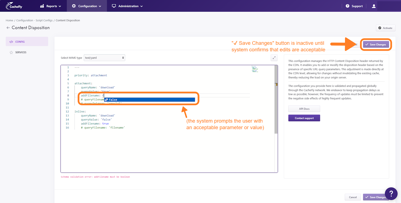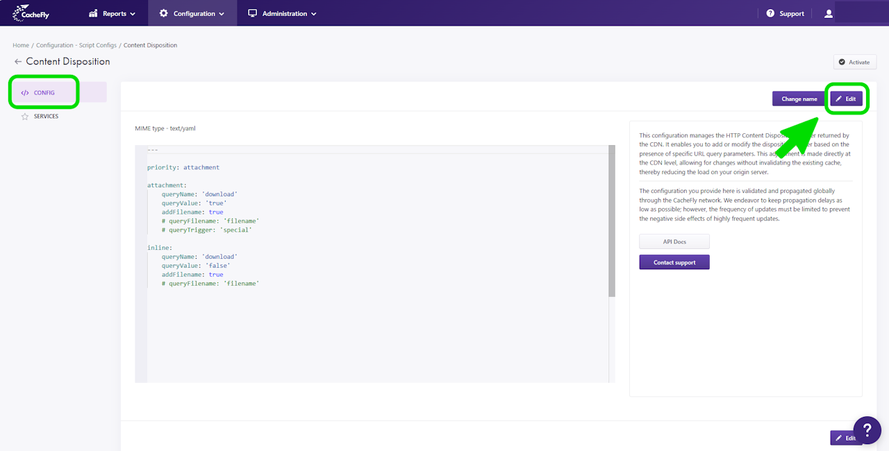 The Content Disposition Script Config manages the HTTP Content Disposition header returned by the CacheFly content delivery network (CDN). It enables you to add or modify the disposition header based on the presence of specific URL query parameters. This adjustment is made directly at the CDN level, allowing for changes without invalidating the existing cache, thereby reducing the load on your origin server.