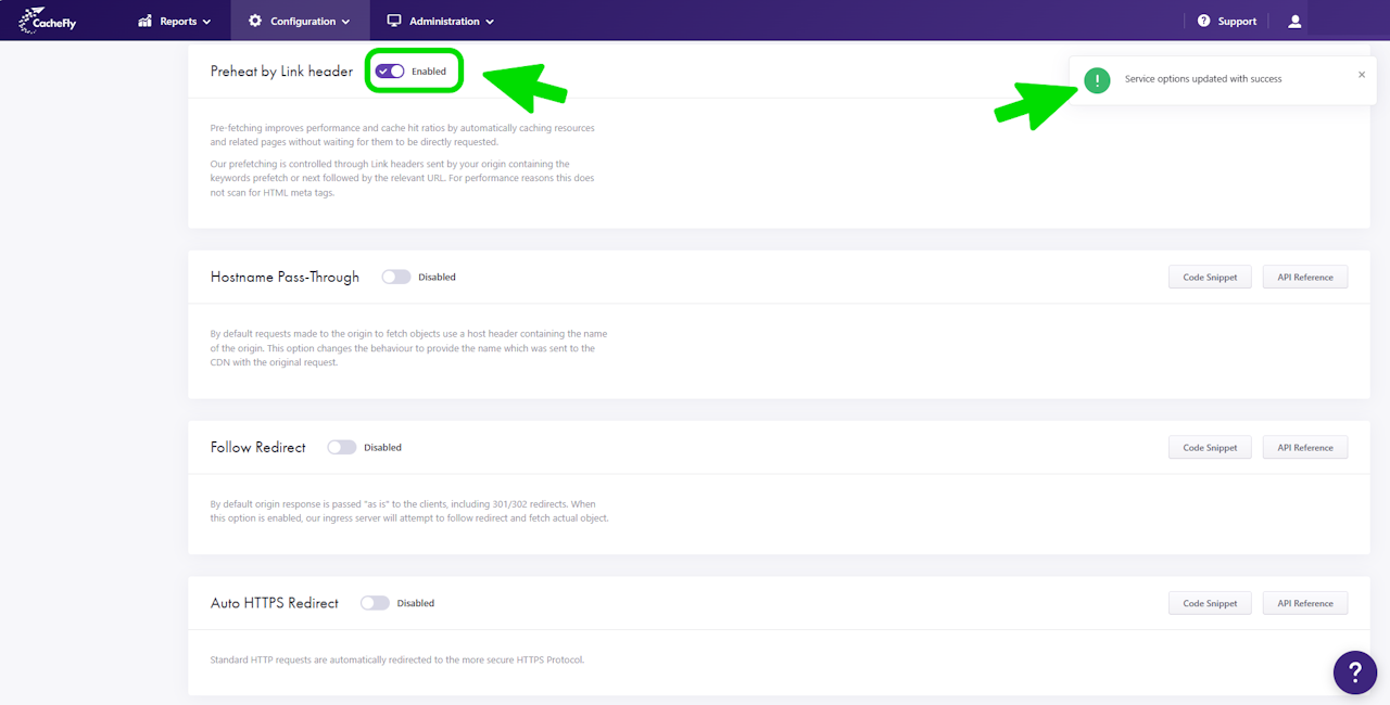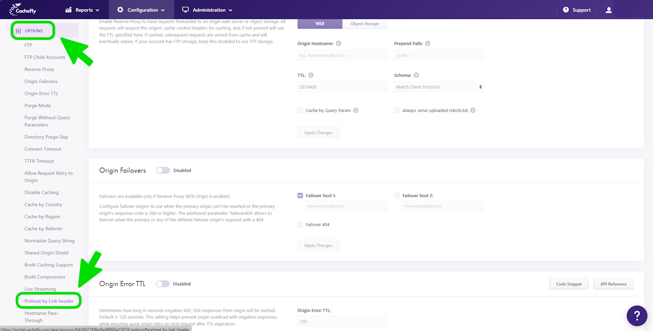 To enable Preheat by Link header for a specific service, first navigate to the OPTIONS for that service (Configuration > Services > [SERVICE NAME] > OPTIONS in the left-hand menu).